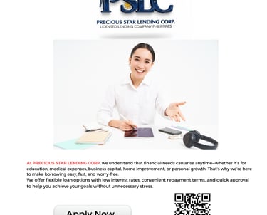 PRECIOUS STAR LENDING CORP. is a duly registered and licensed lending company committed to providing fast, secure, and transparent financial solutions to individuals and businesses across the Philippines. Established on July 10, 2017, our company operates with integrity and professionalism to help clients achieve financial stability and growth.